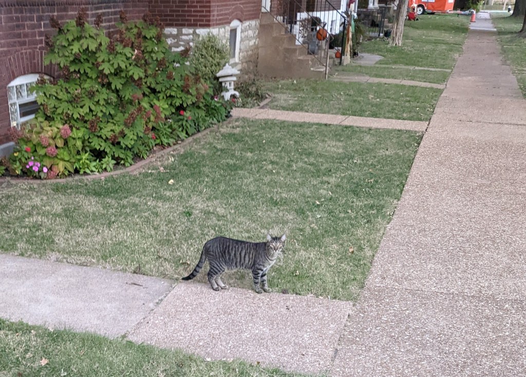 By the time I got home, my lawn mower was ready, so I ran 2 miles back to the repair shop to retrieve, pushed it back home and finally finished cutting my grass. Along my way, I saw a cat, calmly standing on a sidewalk as I noisily passed.